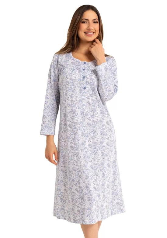 Dámská noční košile 017/52 značky REGINA představuje dokonalou volbu pro ženy, které si potrpí na pohodlí a elegantní vzhled i během odpočinku. Volný střih sahající ke kolenům zajišťuje příjemnou volnost pohybu, zatímco dlouhé rukávy chrání před chladem v chladnějších nocích. Jemný kulatý výstřih doplňují tři decentní knoflíky pro snadné oblékání a osobitý detail. Měkká bavlněná látka s jemným květinovým vzorem působí lehce a svěže – materiál je hladký na dotek, šetrný k pokožce a ideální pro klidné span…