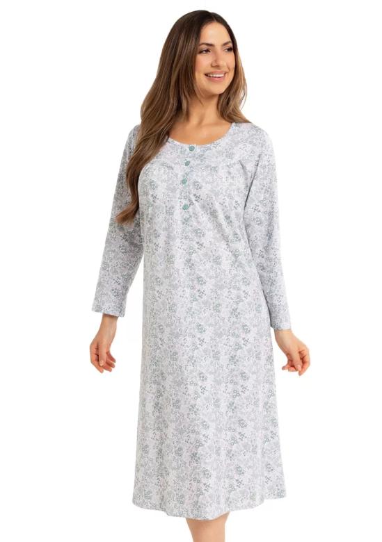 Dámská noční košile 017/53 značky REGINA představuje spojení elegance a pohodlí, které oceníte každý večer. Její klasický střih zajišťuje maximální komfort při spánku i domácí odpočinku. Kulatý výstřih doplňuje decentní knoflíková léga se třemi knoflíky, která dodává jemný nádech tradičního stylu. Jemný květinový vzor v tlumených tónech na světle šedém podkladu působí žensky a přitom nenápadně zdobí celý model.