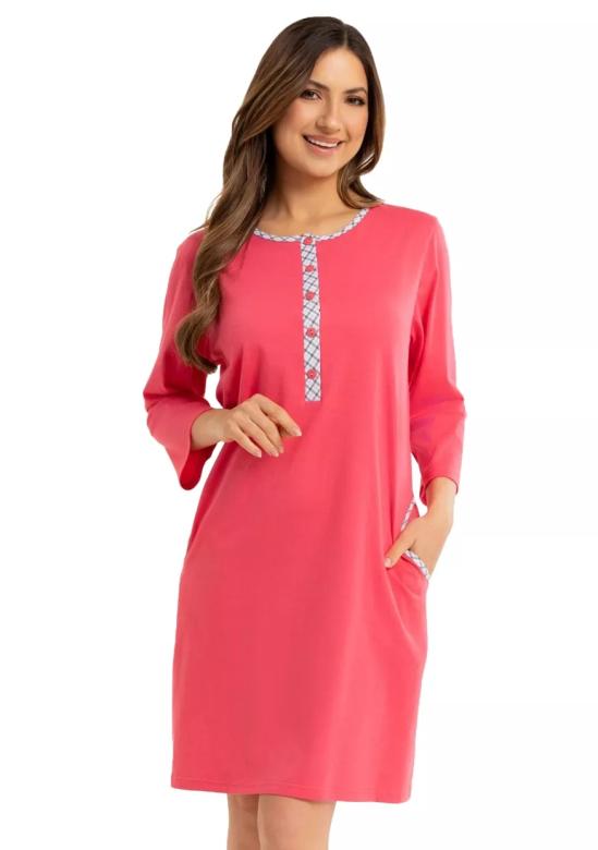 Dámská noční košile 165/51 značky REGINA přináší radost z pohodlí i stylu do každého večera. Zářivý korálově růžový odstín rozzáří Váš domov a jemný vzor na knoflíkové légě dodává šatům osobitý charakter. Volnější střih s kulatým výstřihem a dlouhými rukávy poskytuje maximální volnost pohybu, zatímco praktické kapsy oceníte při domácím lenošení i klidném spánku. Materiál ze 100% bavlny je příjemně měkký, prodyšný a šetrný k pokožce – ideální volba pro každodenní nošení.