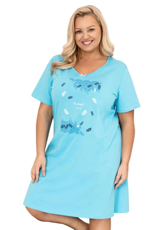 Dámská noční košile 178/63 značky REGINA je dokonalou volbou pro ženy, které si chtějí dopřát pohodlí a elegantní vzhled i během odpočinku. Svěží modrá barva působí radostně a rozjasní každý večer. Véčkový výstřih dodává modelu jemný ženský akcent, zatímco krátké rukávy zajišťují volnost pohybu a příjemnou vzdušnost v teplejších měsících. Přední část zdobí hravé květinové motivy, které vytvářejí originální detail.