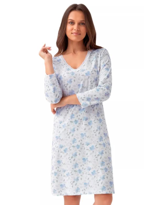 Dámská noční košile 261/52 značky LUNA přináší spojení elegance a pohodlí do Vašeho večerního rituálu. Jemný světle modrý základ s decentním květinovým vzorem v odstínech modré a zelené vytváří harmonický dojem, který potěší oko i mysl. Véčkový výstřih dodává ženskosti a usnadňuje oblékání, zatímco dlouhé rukávy zajišťují příjemné zakrytí bez pocitu těžkosti. střih sahající k lýtkům nabízí volnost pohybu i diskrétní vzhled.
