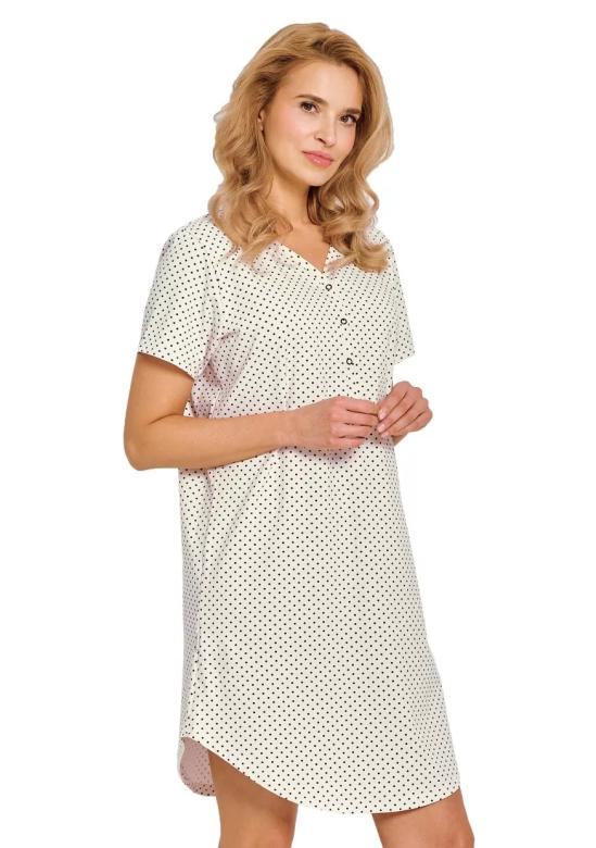 Elegantní a pohodlná volba – Dámská noční košile Meg 3326/52 TARO představuje ideální spojení jednoduchého stylu a praktického designu. Krémový podklad s jemnými černými puntíky dodává košili decentní, avšak zajímavý vzhled, který se hodí pro každou ženu hledající komfort i šmrnc. střih s krátkým rukávem a mírně prodlouženým zadním dílem zajistí příjemný pocit volnosti během spánku i odpočinku doma. Přední zapínání na knoflíky usnadňuje oblékání a zároveň podtrhuje ženskost modelu.