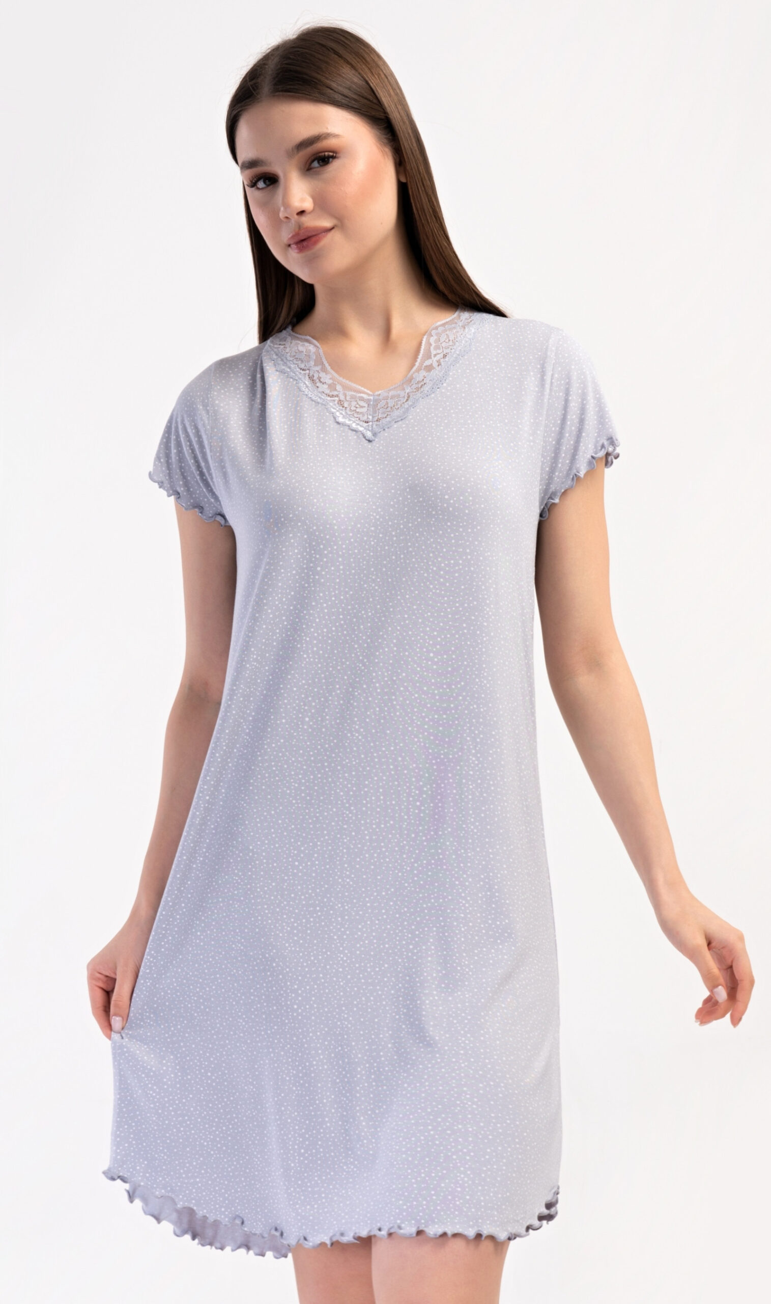 dámská noční košile s krátkým rukávem Vločka. Noční košile s příjemnou délkou po kolena má žlábkování na rukávech a spodním lemu, výstřih je ozdoben krajkou. Na látce košile jsou natištěny drobné puntíky. Použitý viskózový materiál s příměsí lycry je příjemný a poddajný na dotek. Pokyny pro údržbu:- 95% viskoza, 5% lycra- lze prát v pračce při teplotě do 30°- nesušit v sušičce- žehlit z rubu do 110°- nepoužívat bělící prostředky- nečistit chemickyMíry naměřené na výrobku: 4093031820 VločkaSMLXLobvod hrud…