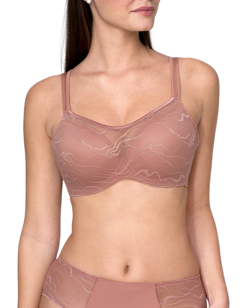 Dámská podprsenka má hladké lisované košíčky, které jsou překryty průhledným tylem s jemným vzorem.