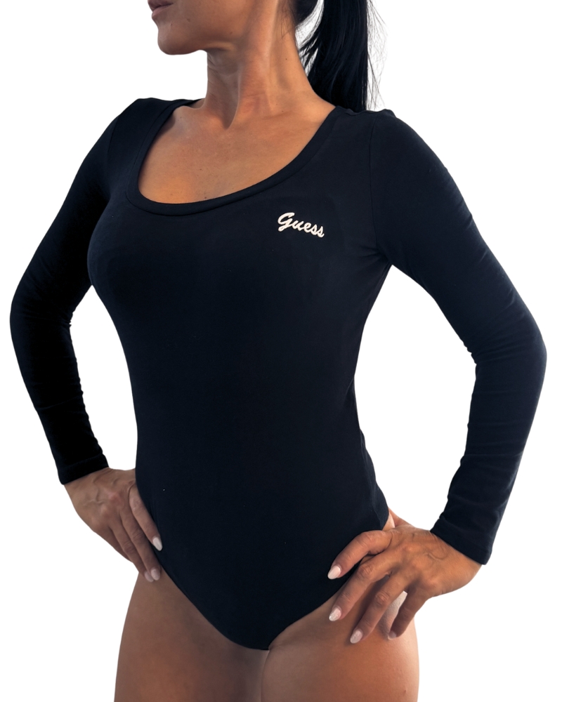 Dámské body s dlouhým rukávem a kulatým výstřihem má v levé části vyšitý nápis Guess.