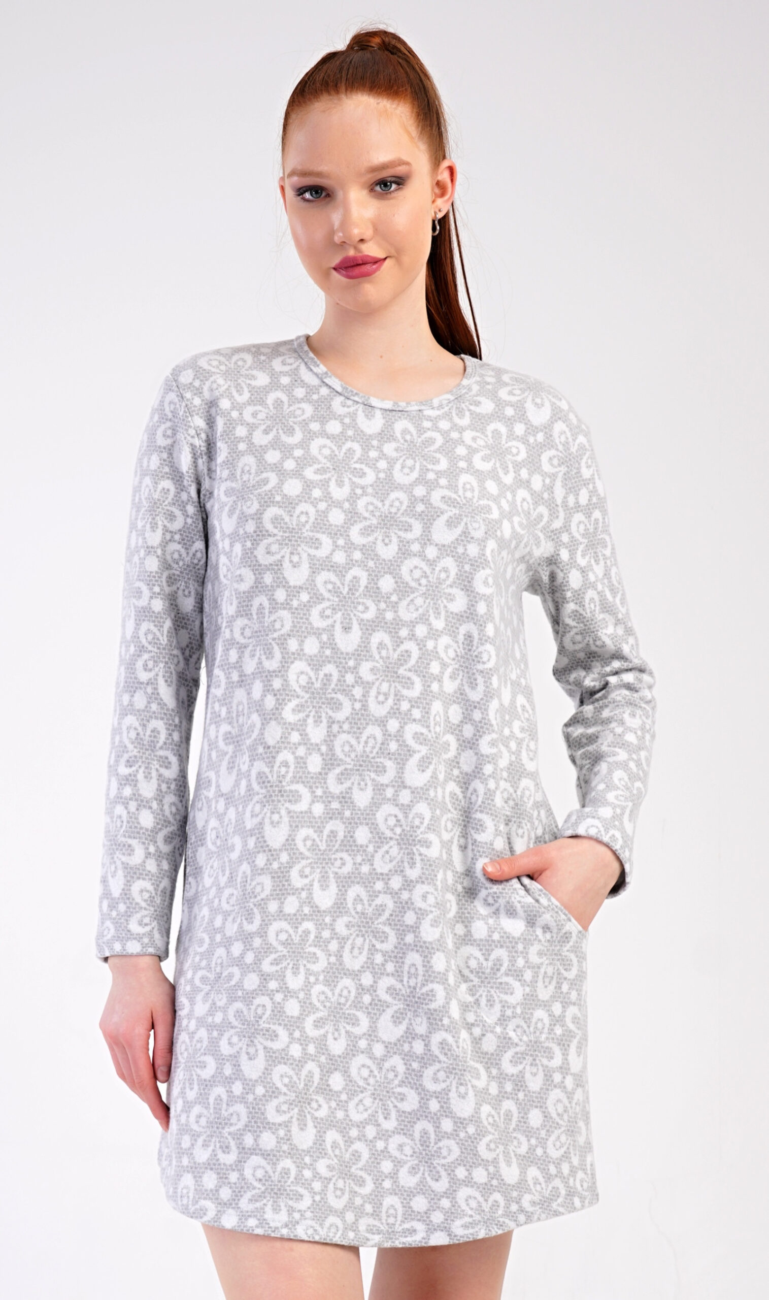dámské domácí šaty s dlouhým rukávem Flowers. Domácí šaty s kulatým výstřihem a kapsami zdobí plastický květinový vzor. Skvěle se hodí k elastickým kalhotám, můžete být doma hezká a zároveň i v teple. Použitý materiál s obsahem bavlny 48% je příjemný a poddajný na dotek.