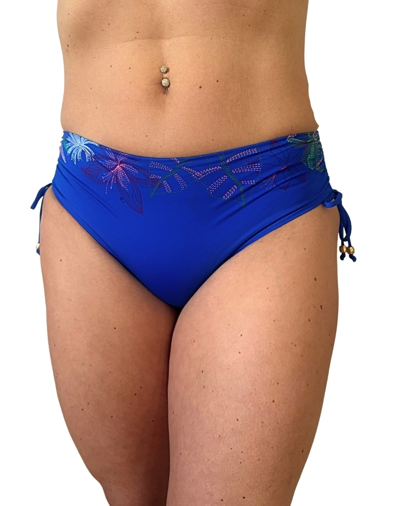 Plavkové kalhotky jsou celopodšité v zajímavém vzoru a po bocích stahovací tkaničky pro regulaci výšky po bocích.