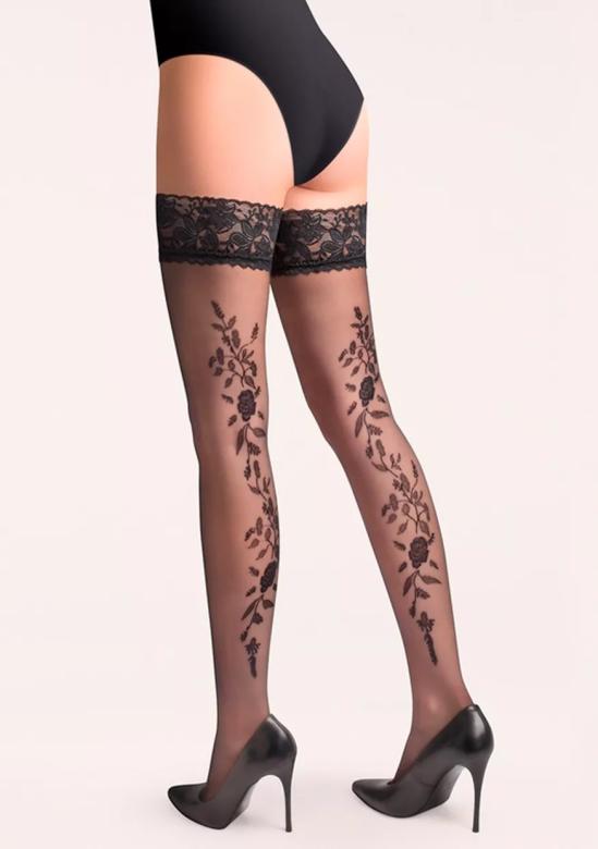 Elegantní samodržící punčochy s dekorem růže jsou dokonalým doplňkem každého ženského šatníku. Jemná květovaná krajka v horní části punčochy je nejen krásná, ale díky dvěma silikonovým páskům zajišťuje pevné a pohodlné držení bez nutnosti použití podvazků.